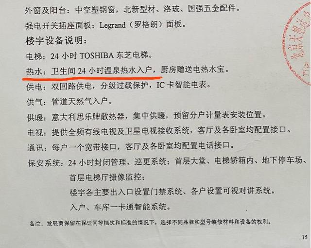 部分业主提供的合同附件显示,卫生间24小时温泉热水入户。受访者供图